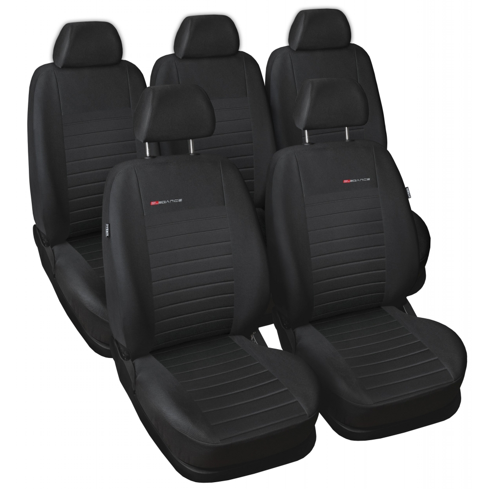 Přední opěradla s kapsami, příprava pod stolky, potah na přední loketní opěrku. Vzadu 3 samostatné sedačky se všemi potřebnými otvory, 5 opěrek hlavy. Lze použít i pro auto bez loketní opěrky - opěrka je samostatna na středové konzole, a v opěradle není otvor.